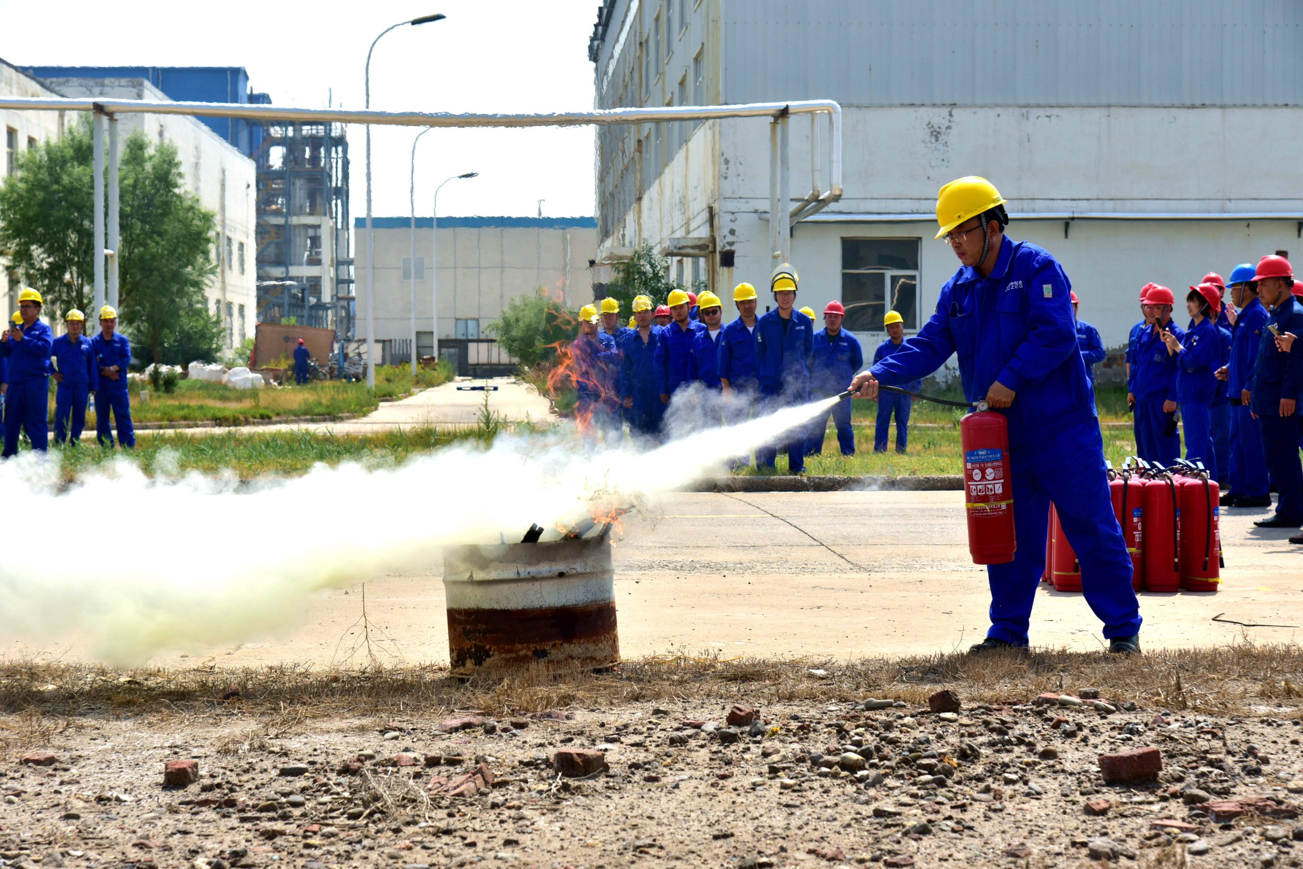 ? ? ? ? 比賽當(dāng)日,全體參賽隊(duì)員安全帽、工作服、勞保鞋穿戴整齊,精神飽滿。在裁判長宣布比賽規(guī)則后,井然有序的按抽簽號碼列隊(duì)逐一進(jìn)行消防知識口試?!皢枺煞凼綔缁鹌骺捎糜谀男╊愋偷幕馂?zāi)撲救?”“答,干粉式滅火器可用于可燃固體、可燃液體、可燃?xì)怏w、電氣著火等火災(zāi)撲救,因?yàn)楦煞凼遣粚?dǎo)電的,可以用于撲救帶電設(shè)備火災(zāi)?;卮鹜戤??!薄盎卮鹫_!”進(jìn)行答題的參賽隊(duì)員充滿自信,看得出對消防基礎(chǔ)知識掌握的十分扎實(shí)。在隨后現(xiàn)場實(shí)操環(huán)節(jié),參賽隊(duì)員按照滅火器使用要領(lǐng),手提干粉式滅火器迅速奔赴著火點(diǎn)上風(fēng)向幾米處,顛倒搖動(dòng)滅火器,拔出保險(xiǎn)銷,手持膠管頸部,對準(zhǔn)火焰根部由近及遠(yuǎn)進(jìn)行噴射,并左右掃射,壓制火焰防止竄回,直至火焰熄滅。整個(gè)滅火過程用時(shí)只有幾秒鐘時(shí)間,動(dòng)作干凈利索,顯示了自身消防技能的專業(yè)與熟練!